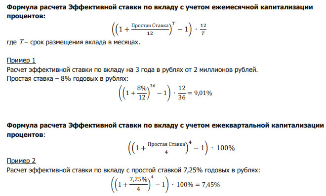 Ставки указаны в % годовых. Ставка по вкладу с учетом капитализации процентов рассчитана по формулам: